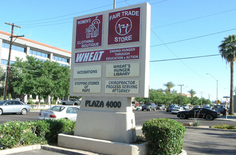 This is a very nice center that was totally renovated including a totally new Santa Fe facade, all new bathrooms and landscaping. All of the suites’ interiors have been totally renovated and many include a unique curved wall in the reception area. Suites in the west building have rear exits close to more parking. This building offers excellent value (i.e. high quality space for the price) and a convenient location on 7th Street just south of Indian School. Signage is available on the large monument sign that faces the high traffic on 7th Street at no extra monthly cost.